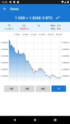 Utöver snabba omvandlingar ger applikationen dig en djupgående överblick över Bitcoins historiska kursutveckling mot den amerikanska dollarn. Granska detaljerade diagram som visar kursförändringar från de senaste veckorna och månaderna, inklusive både högsta och lägsta noterade värden. Anpassa enkelt tidsperioden för diagrammen för att analysera data över en månad, ett kvartal, ett halvår eller ett helt år, vilket ger dig en omfattande förståelse för marknadens rörelser och trender.