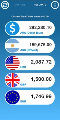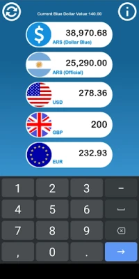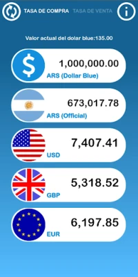 Få omedelbara och aktuella valutakurser för en rad viktiga valutor, inklusive den officiella ARS Peson, USD Dollar, GBP Brittiskt Pund och EUR Euro. Men det som verkligen utmärker den här applikationen är dess unika förmåga att visa "Blå Dollar"-kursen (även känd som Dolar Blue eller inofficiell dollar). Denna parallella kurs för USD i Argentina representerar kostnaden för att köpa och sälja fysiska dollarbuntar på inofficiella platser i Buenos Aires. Det är den mest fördelaktiga kursen för transaktioner med fysiska sedlar, helt utan inblandning från statligt sanktionerade institutioner som banker.