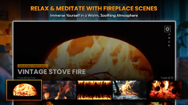 Utforska en enastående samling med över 120 noggrant utvalda eldplatser och scener, presenterade i bländande HD- och 4K-kvalitet. Från traditionella öppna spisar och mysiga vinterbränder till festliga teman och rustika lägereldar, finns det en atmosfär för varje tillfälle. Upplev den autentiska ljudbilden med äkta sprakande ljud och det rogivande knastret från brinnande ved, inspelat från verkliga eldar för en fullständigt omslutande upplevelse. Förstärk stämningen ytterligare med valfri bakgrundsmusik designad för avkoppling, eller välj att låta eldens rena, naturliga ljud stå i centrum.