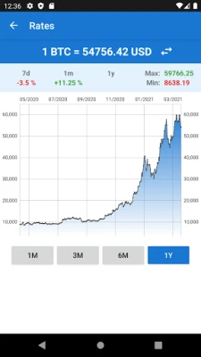 Utöver snabba omvandlingar ger applikationen dig en djupgående överblick över Bitcoins historiska kursutveckling mot den amerikanska dollarn. Granska detaljerade diagram som visar kursförändringar från de senaste veckorna och månaderna, inklusive både högsta och lägsta noterade värden. Anpassa enkelt tidsperioden för diagrammen för att analysera data över en månad, ett kvartal, ett halvår eller ett helt år, vilket ger dig en omfattande förståelse för marknadens rörelser och trender.