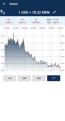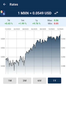 Omvandla belopp enkelt mellan mexikansk peso (MXN) och amerikansk dollar (USD). Denna app visar även tydliga diagram med historiska växelkurser för MXN och USD, vilket ger dig insikt i valutafluktuationer.